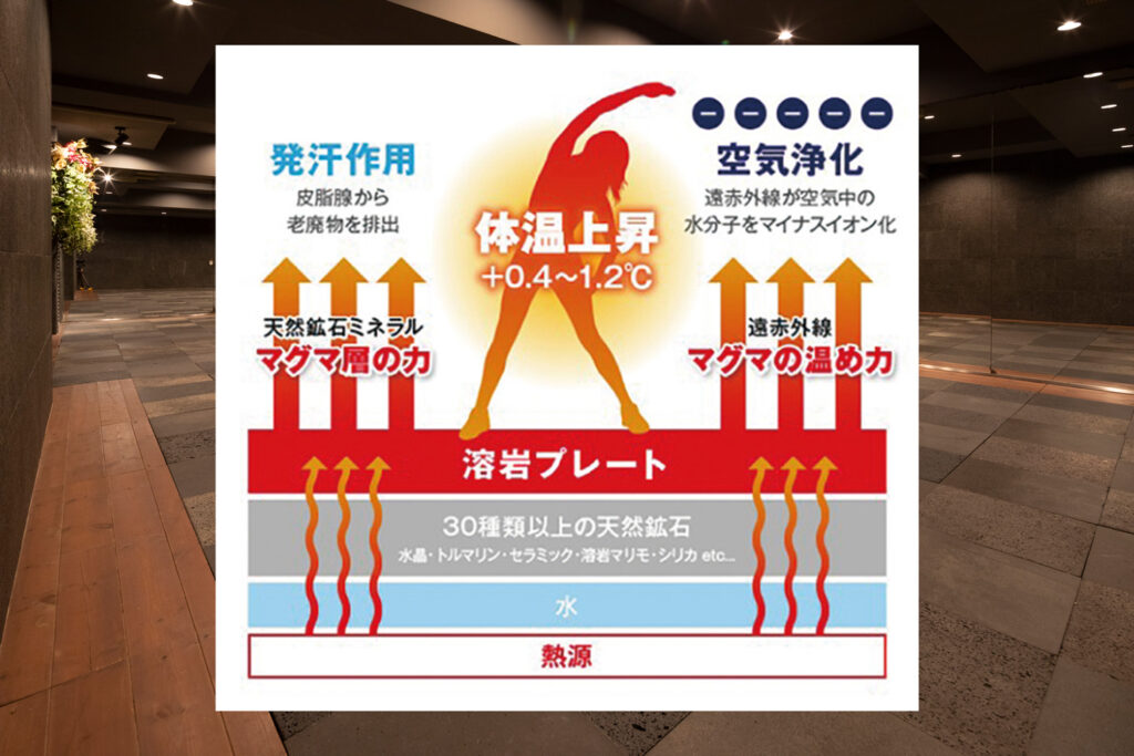 溶岩が持つ「熱反射効率」に着目し、オリジナルのMAGMA(天然溶岩)プレートを作りました。プレートを介して熱を伝えるため、「熱反射効率」と「育成光線効果」により心地よく体内深部温度を高めることが可能です。自然由来のエネルギーを効率よく人体に取り入れることに成功しました。